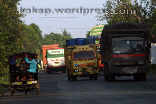 Pada sebuah ruas di pantura perbatasan Jawa Tengah – Jawa Timur, sebuah kendaraan roda tiga hasil modifikasian yang dioperasikan sebagai kendaraan umum, terpojok di antara kendaraan lain yang lebih besar dan kuasa.