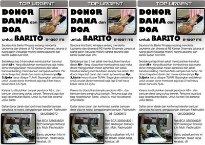 Ramadhan 1431 ini, tiba-tiba saja berita tentang kawan Barito, yang biasa kami panggil Toto, segera menyebar. Dari kawan-kawan Siklus, kemudian beredar dari milis ke milis, dan tentu saja di media sosial macam facebook dan twitter. Dikabarkan, Toto divonis menderita leukimia yang senantiasa membutuhkan donor darah AB+. Asuransi yang meng-cover biaya kesehatannya sudah melebih batas, sehingga kawan-kawan alumni Siklus memprakarsai aksi solidaritas untuknya.