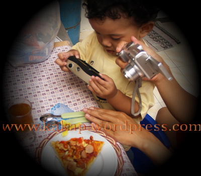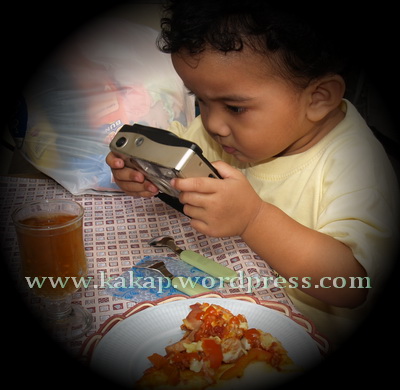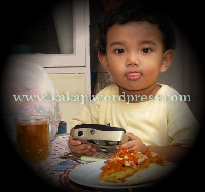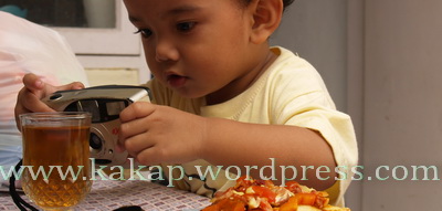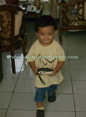 Saat kami berdua sibuk di belakang dengan masing-masing membawa kamera, tiba-tiba Varo ikut nimbrung sambil membawa kamera mainannya (dulunya kamera beneran, kamera pocket merk Fuji yang masih menggunakan film dan sudah rusak). Segera saja kami tergelak. Gak menyangka akan ulah si bungsu yang waktu itu berusia 25 bulan.