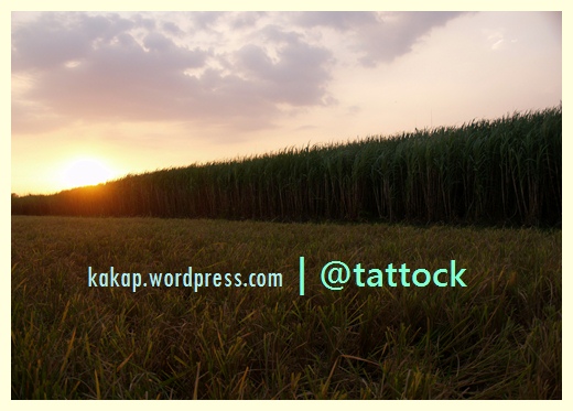 Dalam sebuah perjalanan kembali ke Surabaya usai rutinitas pekerjaan, saya berkesempatan mengabadikan keduanya yang bertepian. Padi yang telah menguning, tebu dewasa yang juga menunggu giliran dipanen berbalur jingga matahari yang hendak tenggelam.