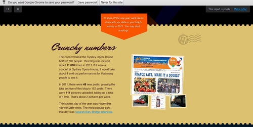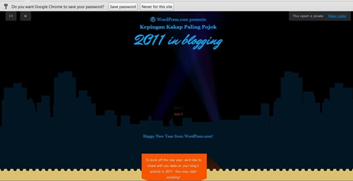 Sebuah laman yang khusus dibuat bagi pengguna wordpress, tentang segala aktivitas selama tahun 2011 kemarin. Laman yang sependek ingatan saya, baru pada tahun ini saya terima. Dari sana saya kemudian tahu bahwa pada tahun 2011 kemarin saya menulis 48 posting, sepertiga dari total posting yang pernah saya buat selama ini. Tetapi, dari sepertiga itu (berarti rata-rata hampir tiap minggu ada satu postingan, terlewatkan 4 minggu tanpa postingan) telah meningkatkan jumlah pengunjung hampir dua kali lipat dibandingkan jumlah pengunjung sebelumnya.