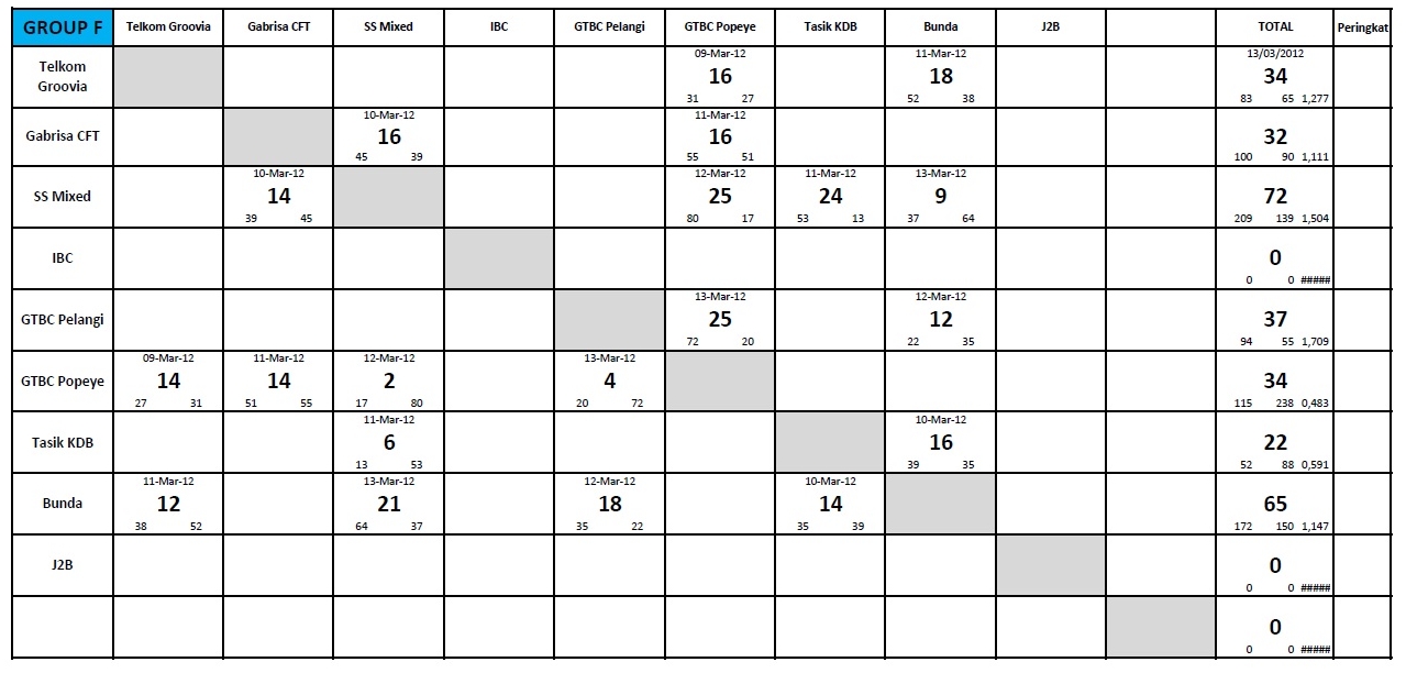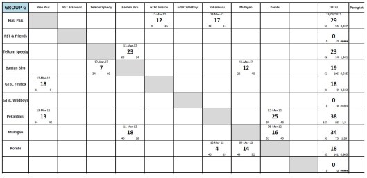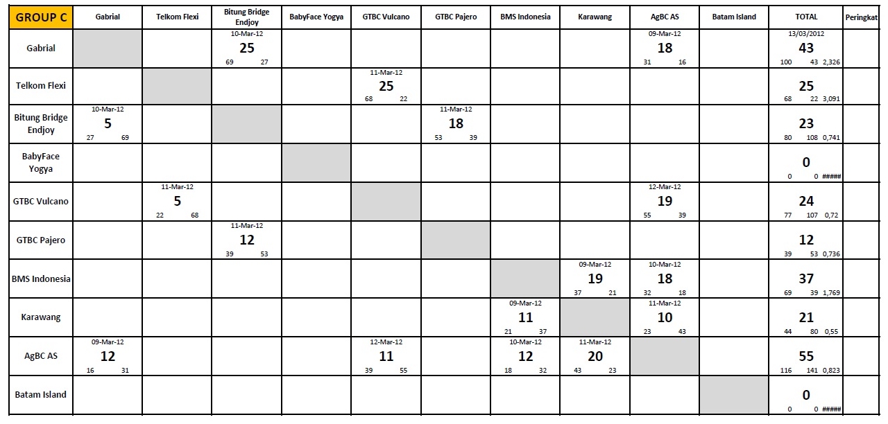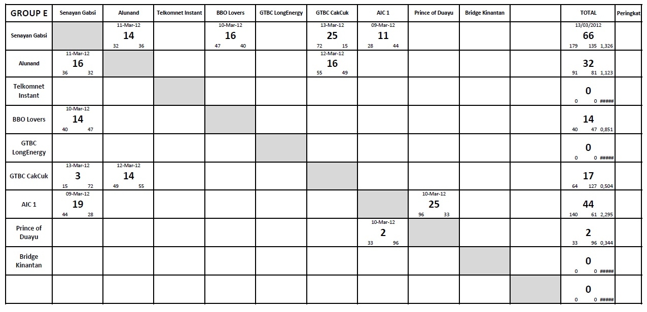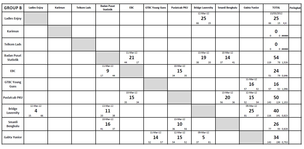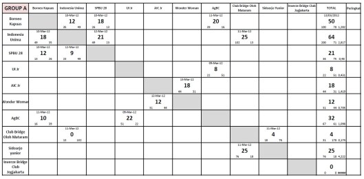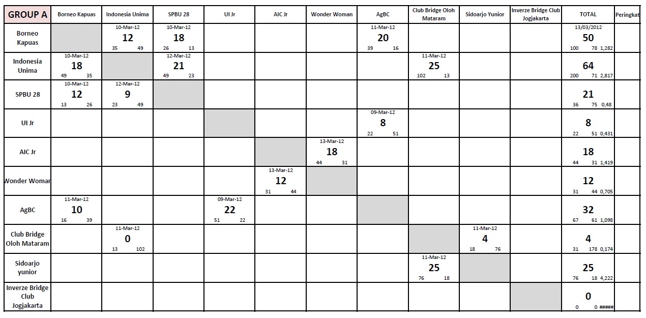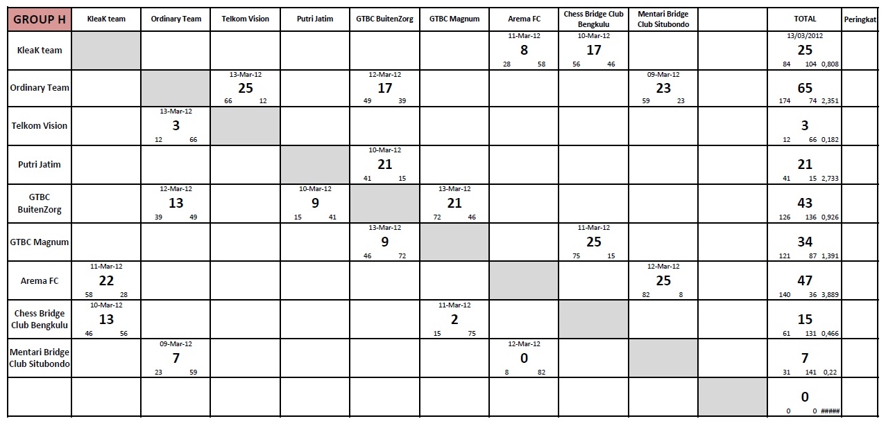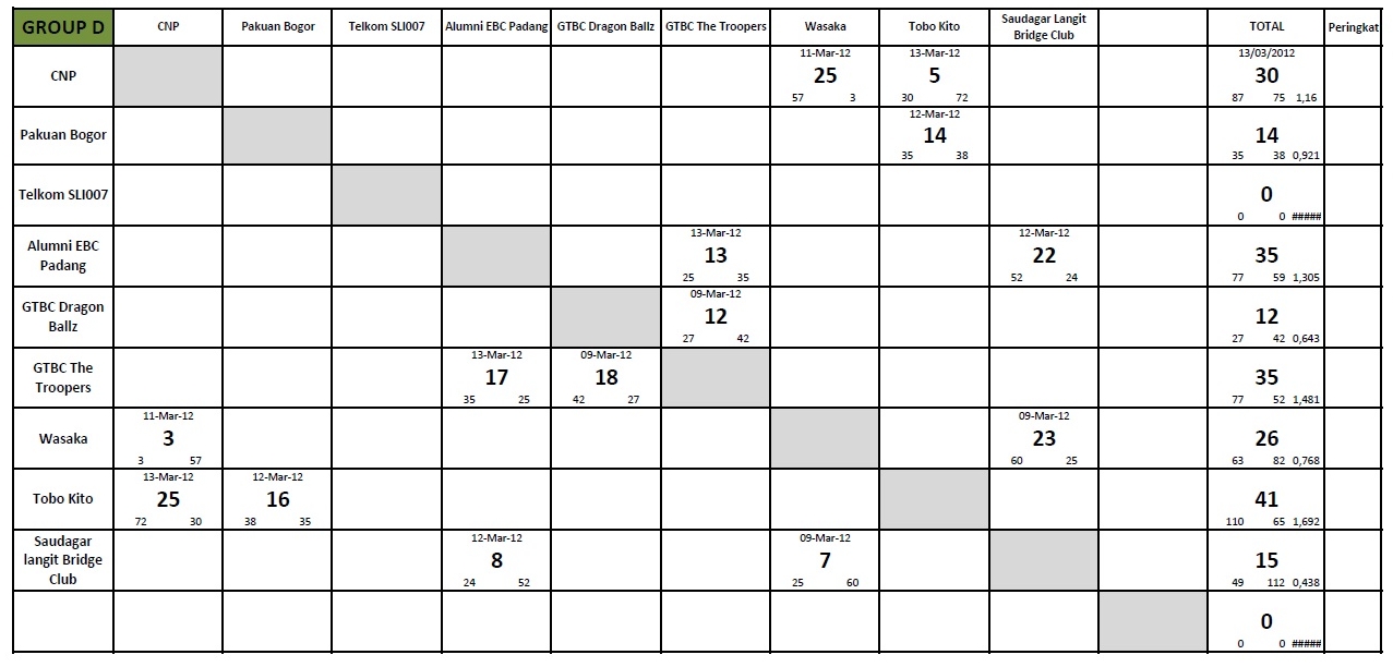 Meski demikian, masih ada beberapa regu yang sama sekali belum bertanding. Misalnya saja: Inverze Bridge Club Jogja (group A), Karimun dan Telkom Lads (group B), BabyFace Yogya dan Batam Island (group C), Telkom SLI 007 (group D), GTBC LongEnergy, Telkomnet Instant, dan Bridge Kinantan (group E), IBC dan J2B (group F), serta RET & Friends dan GTBC WildBoys (group G).