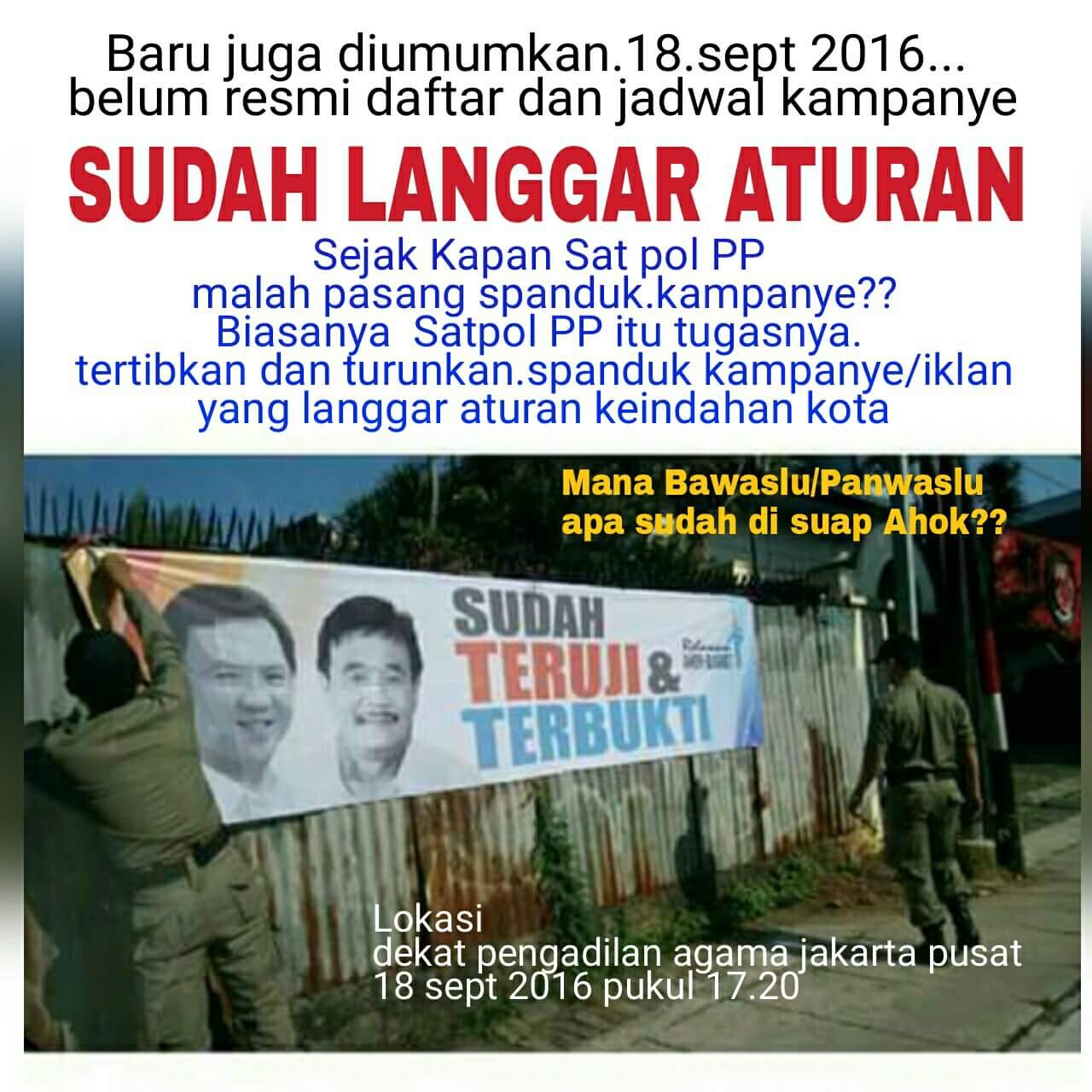 Selintas, bisa jadi begitu. Tampak dari foto dua orang berseragam satpol PP sedang berinteraksi dengan spanduk Ahok Djarot. Masalahnya, interaksi sang aparat dengan spanduk itu apakah sedang posisi memasang, atau sedang melepas atau malah sedang membetulkan, perlu pengamatan yang lebih jeli.