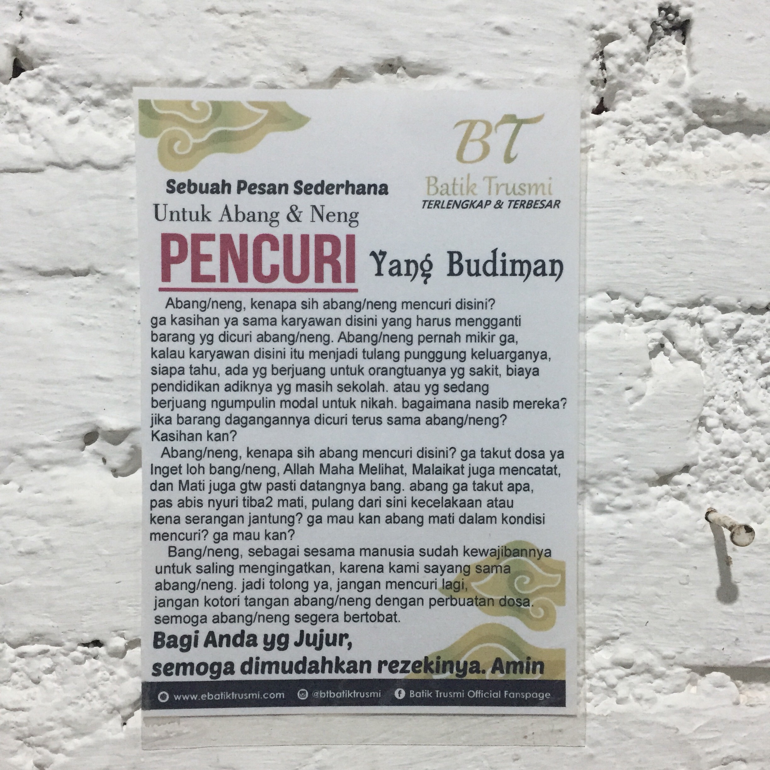 Seberapa efektifkah himbauan kepada pencuri yang budiman tersebut mengurangi tingkat pencurian? Sayangnya, saya tidak sempat bertemu dan menanyakan ke seseorang di sentra batik tersebut yang bisa memberikan penjelasan mengapa himbauan itu dibuat dan bagaimana efek dari himbauan itu sejak dibuat. Berkurangkah? Efektifkah?