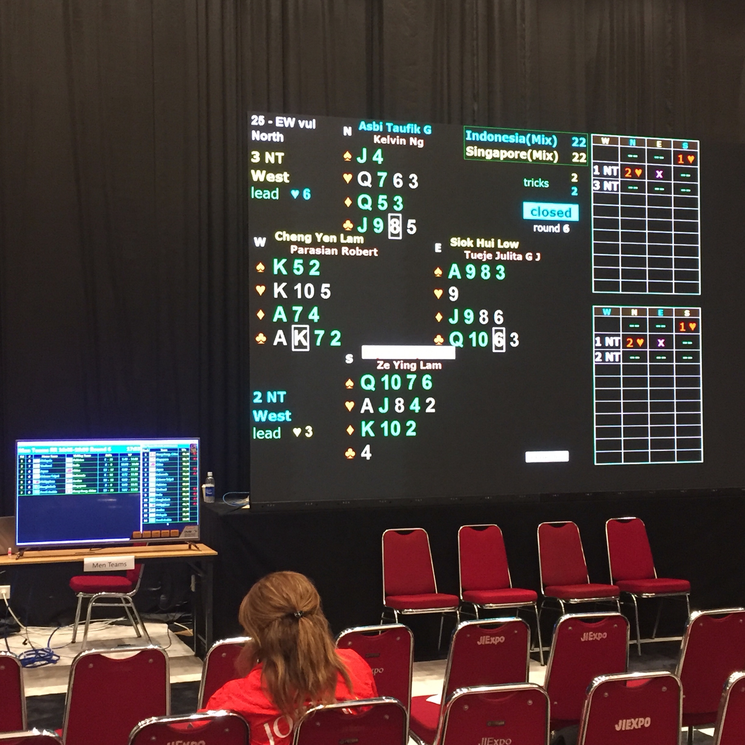 Saya menoleh ke belakang, memalingkan sejenak atas papan menarik, papan terakhir pertandingan antara Indonesia Mix Team melawan Singapura Mix Team. Di meja sebelah, Indonesia hanya menutup kontrak 2S+2, sedangkan di meja satunya, pemain Singapura dengan gampang menemukan game score, 3NT, yang bisa mati jika declarer salah bermain atas defens ketat. Antara menambah poin keunggulan atau malah berkurangnya margin kemenangan.