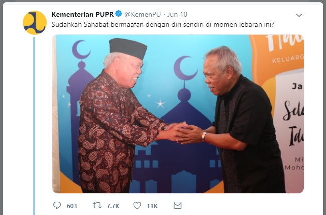 Tiba-tiba saya diingatkan tentang hal memaafkan diri sendiri itu oleh postingan akun resmi Kementerian Pekerjaan Umum yang postingannya menyeruak di linimasa twitter saya. Postingan yang per hari ini (13/6) di-retweet lebih dari 7.000 kali, dan di-like lebih 11.000 kali, mungkin diniatkan sebagai becandaan karena postingan itu memuat foto Pak Menteri Basuki Hadimuljono yang sedang bersalaman dengan foto replika Pak Menteri itu sendiri, kemudian disisipkan kutipan: