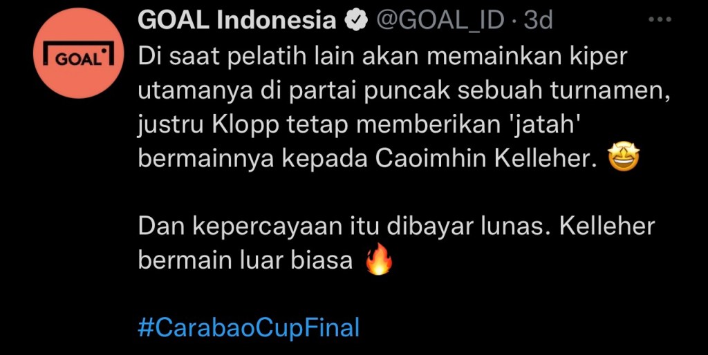 Biasanya memang untuk ajang FA Cup dan Carabao Cup, adalah saat memberikan kesempatan pemain pelapis untuk menambah jam terbang sekaligus merotasi pemain untuk mendapatkan kebugaran. Khususnya untuk kiper. Nah, sepanjang Liverpool era Klopp, baru musim ini Liverpool tembus ke final. Maka pilihan bagi Klopp akankah ia mengganti pemain pelapis dengan pemain utama ketika piala di depan mata? Seperti kutipan di atas, ternyata ‘human being won’. Caoimhin yang tampil gemilang sepanjang ajang Carabao Cup layak dipercaya untuk tampil di final. Dua kali tak kebobolan saat melawan Norwich di babak ketiga dan Preston North End di babak keempat, kemudian menang adu penalti saat lawan Leicester di perempat final, serta dua kali cleansheet di leg pertama dan kedua versus Arsenal, membuat Klopp sentimental.