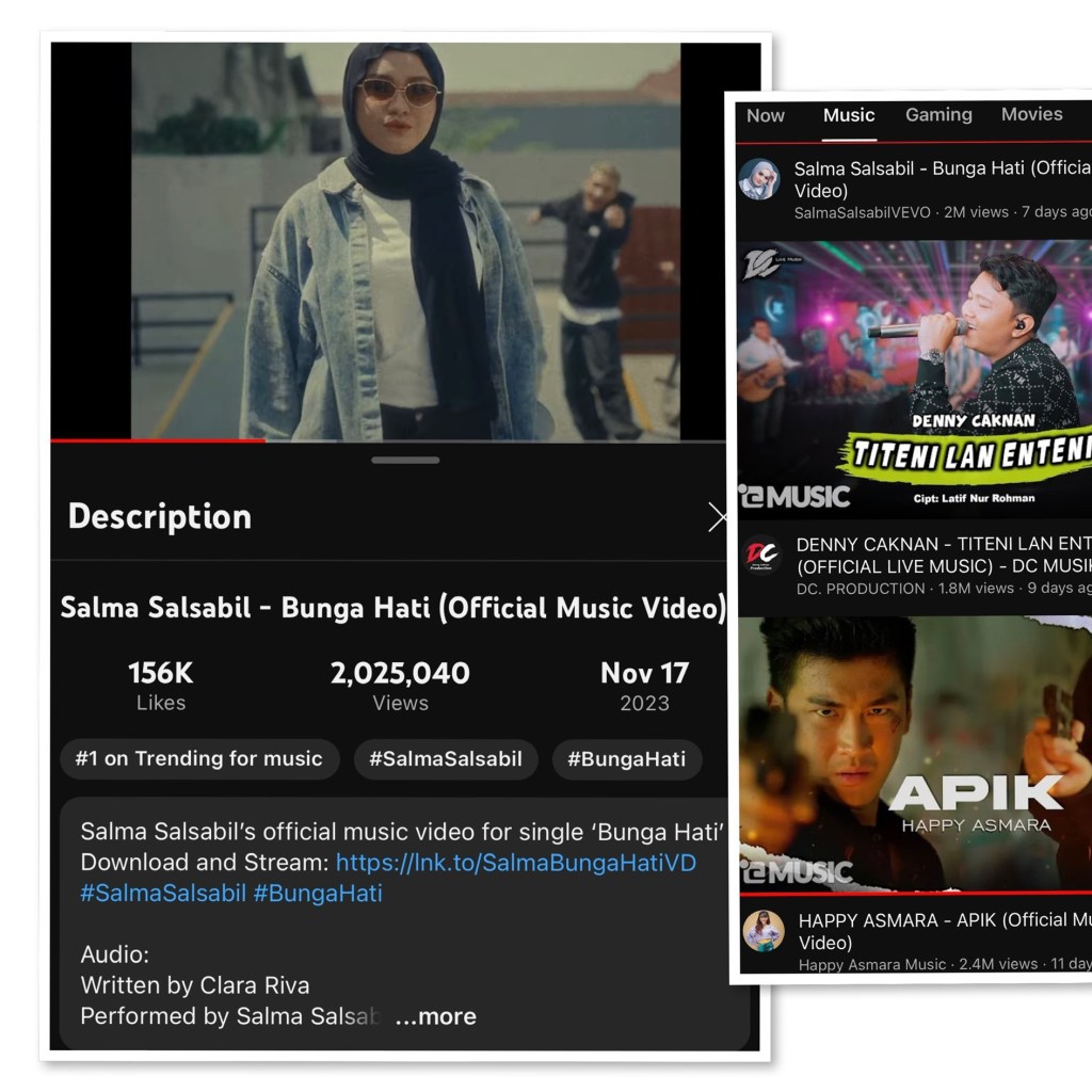 Hingga tulisan ini dibuat (24/11), official music video ‘Bunga Hati’ sudah ditonton lebih dari 2 juta viewers, beradu trending dengan duo mantan pasangan penyanyi di genre yang lain: Denny Caknan yang baru rilis ‘Titeni lan Enteni’ dan Happy Asmara yang juga baru rilis ‘Apik’.