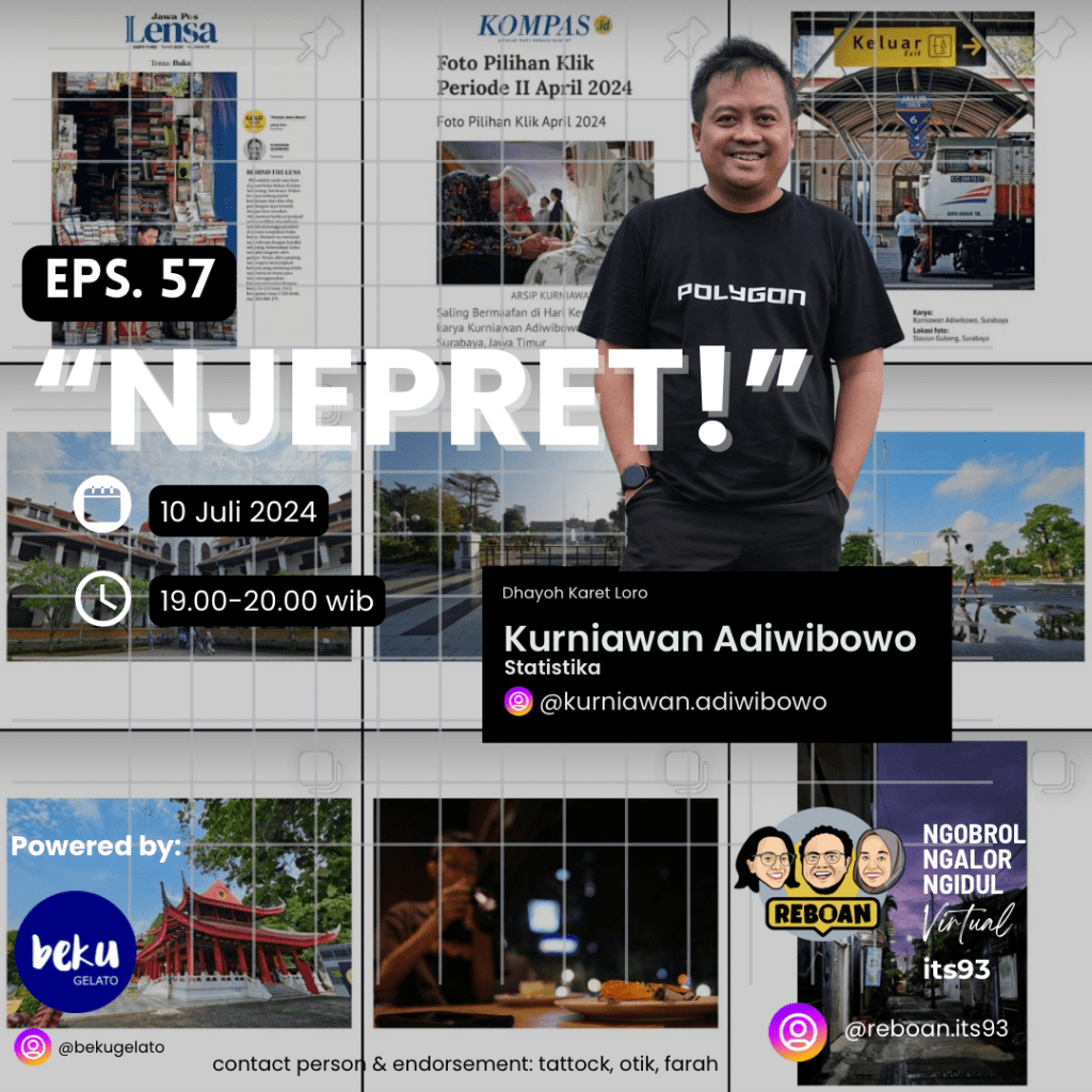 Sebelum memilih judul itu, awalnya diusulkan ‘Cekrek’. Tapi khawatir dianggap sebagai nama depan, yang nama belakangnya ditengara adalah Eningbca, akhirnya ‘njepret’ disetujui para pihak sebagai judul-judulan episode yang mendatangkan Dhayoh Karet Loro, istilah di Reboan kami membahasakan Guest Star, Kurniawan Adiwibowo. Berasal dari Solo, pria yang biasa dipanggil Adi ini diterima di ITS angkatan 1993 di jurusan Statistika sebagai pilihan pertama dengan UGM sebagai pilihan kedua. Selepas lulus dari ITS, sempat berkarir di Batam sebelum kembali ke Surabaya untuk bekerja pada perusahaan brand rokok terkemuka sebelum pindah ke perusahaan brand sepeda yang juga terkemuka.