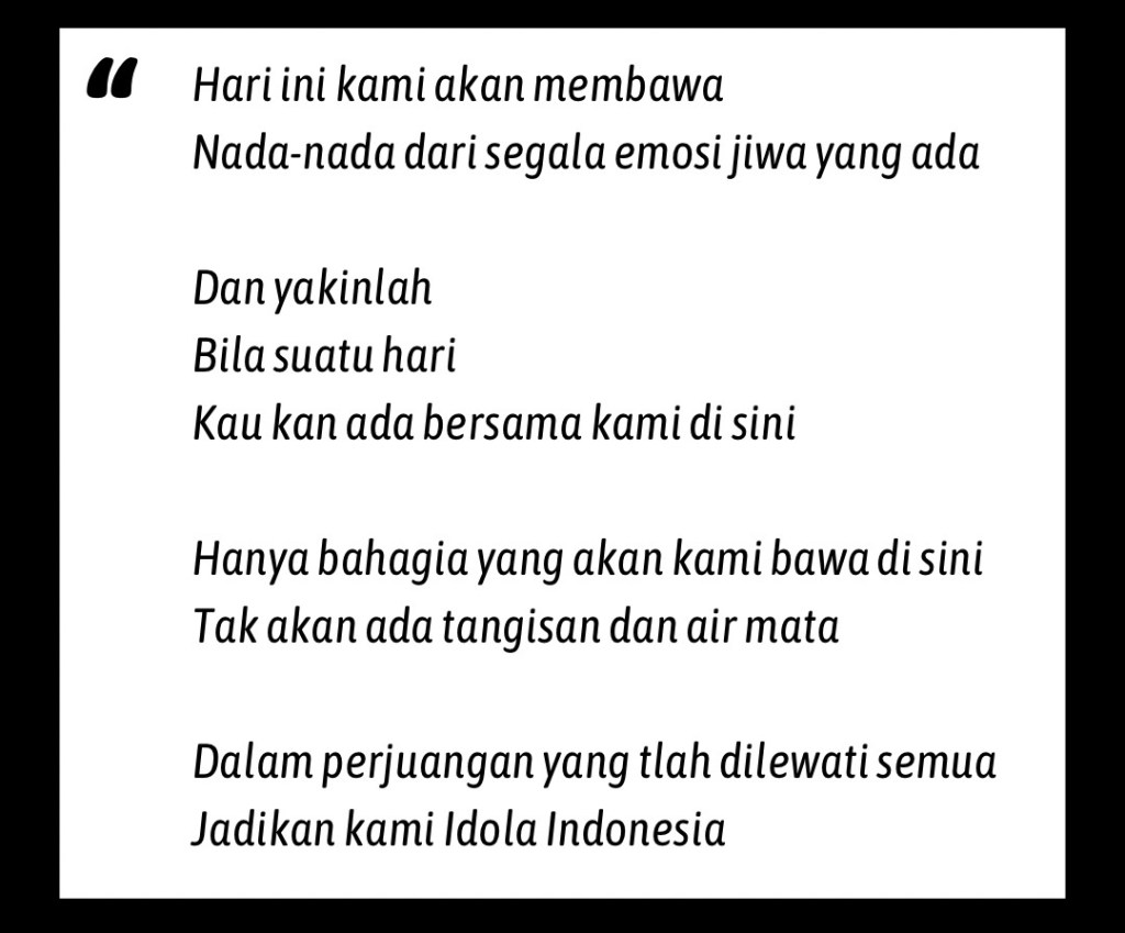 Apa yang menyenangkan dari Indonesian Idol hingga harus ditengok? Tak lain dan tak bukan adalah melihat mimpi-mimpi talenta-talenta baru menemukan panggung serta etalase yang mengantarkan gemerlap realita yang sebelumnya tampak jauh tak terjangkau menjadi jalan kehidupan baru mereka.